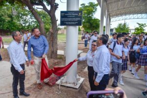 *Durante la inauguración de una techumbre en el Centro de Estudios Tecnológicos, Industrial y de…