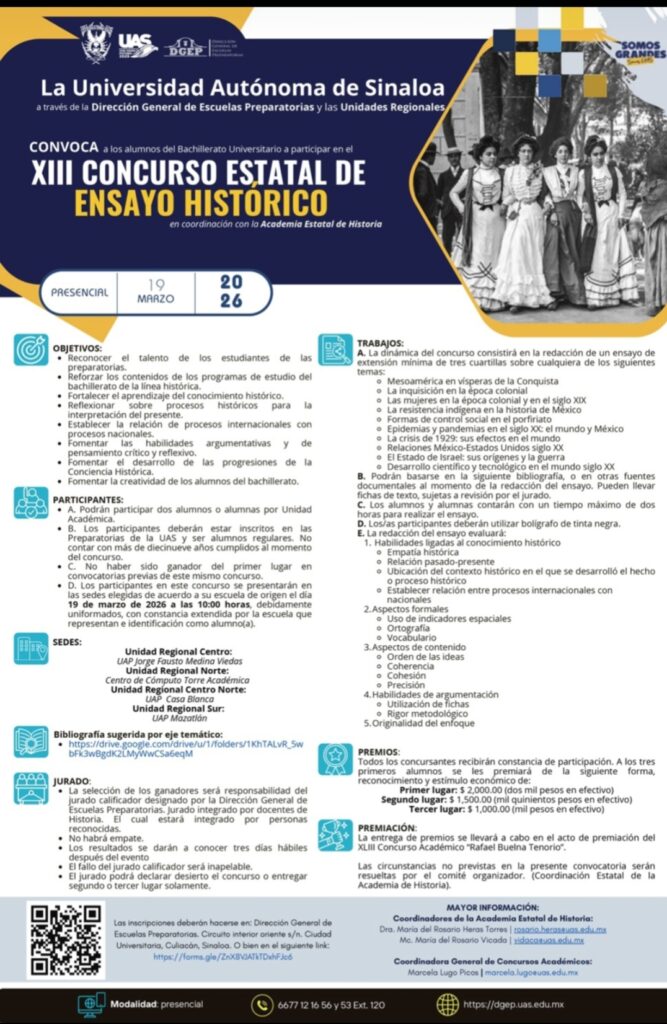 Siendo para los bachilleres el estudio de la historia fundamental no sólo como acumulación de datos, sino como una herramienta de formación ciudadana y pensamiento crítico, la Dirección General de Escuelas Preparatorias (DGEP) de la Universidad Autónoma de Sinaloa (UAS) está convocando, para el 19 de marzo del presente a año, a participar en el XIII Concurso Estatal de Ensayo Histórico, informó la doctora María del Rosario Heras Torres.
