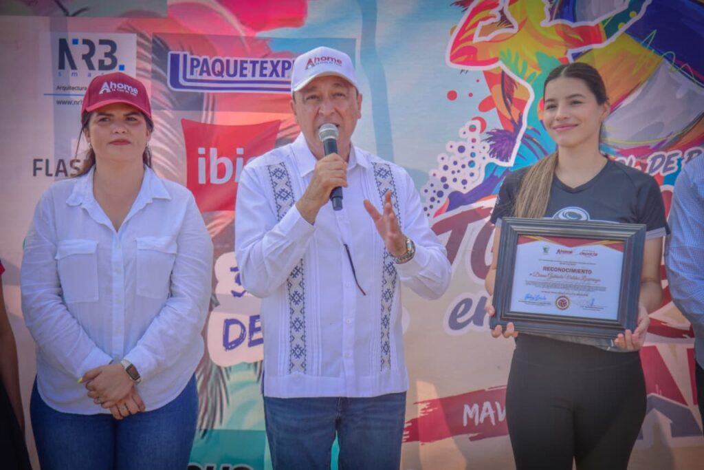 *El Presidente Municipal Antonio Menéndez encabezó el arranque de la competencia, donde se entregó un reconocimiento a Diana Gabriela Valdez Lizárraga por su destacada trayectoria en el deporte…