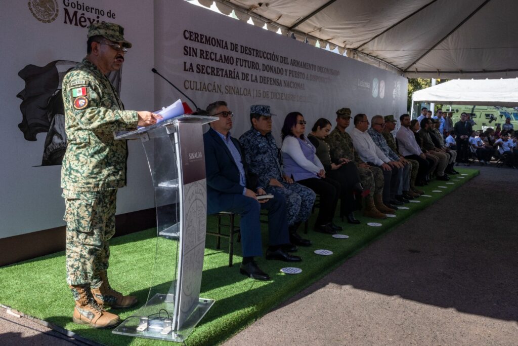 «Las armas que hoy serán inutilizadas son el resultado del trabajo firme y constante de las Fuerzas Armadas, en conjunto con las fiscalías e instituciones de seguridad pública como la Guardia Nacional, las policías estatales y municipales en su lucha contra la delincuencia y en la preservación del orden y la justicia. Su aseguramiento representa la acción decidida y coordinada de los gobiernos de la república, del estado de Sinaloa y del municipio de Culiacán para restablecer la tranquilidad y organizar el estado de derecho en cada rincón de nuestro país”, afirmó el comandante de la Novena Zona Militar.