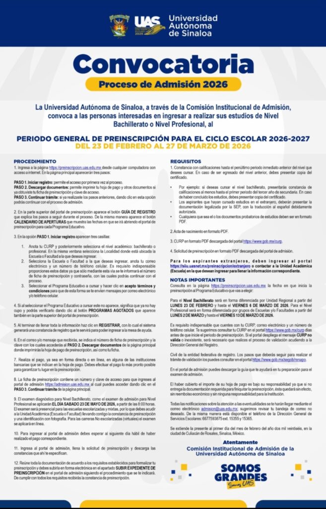 Con una infraestructura tecnológica reforzada y reafirmando su compromiso con la cobertura universal, la Universidad Autónoma de Sinaloa (UAS) arrancará formalmente este 23 de febrero el proceso de preinscripción para el Ciclo Escolar 2026-2027. El proceso iniciará con la entrega de fichas para el nivel bachillerato, seguida por el nivel licenciatura el 2 de marzo.