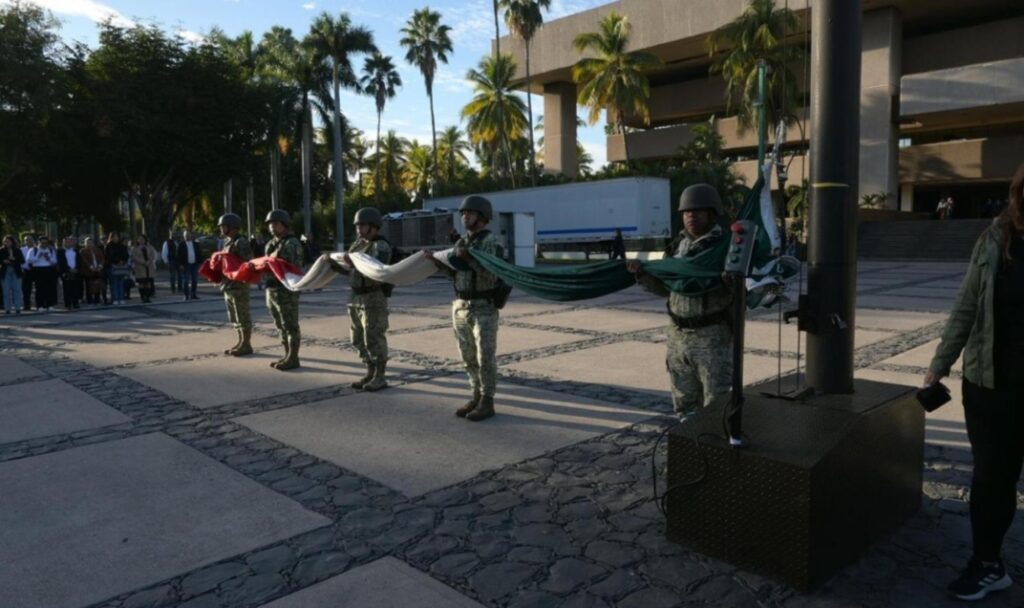 Culiacán, Sinaloa a 23 de enero de 2025. Autoridades civiles y militares conmemoraron el aniversario luctuoso número 101 del general Rafael Buelna Tenorio “El Granito de Oro”, con un izamiento de bandera a media asta y con honores de ordenanza en la plaza cívica de Palacio de Gobierno.