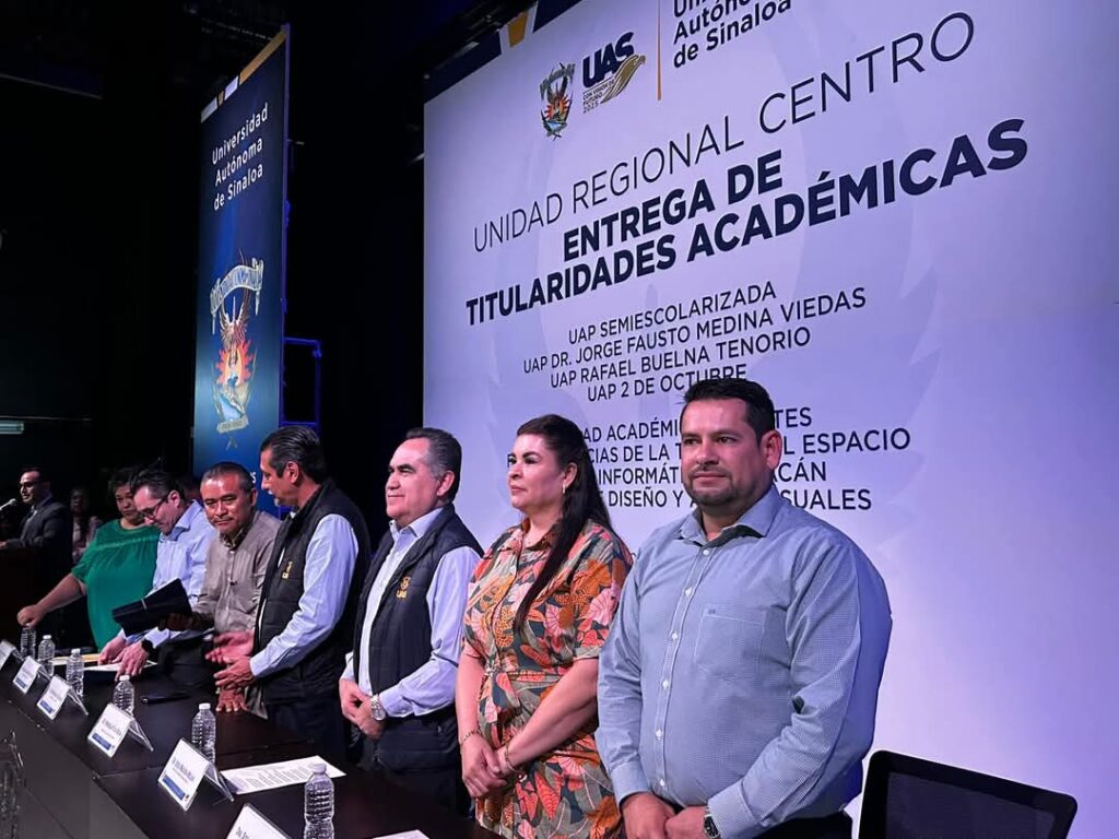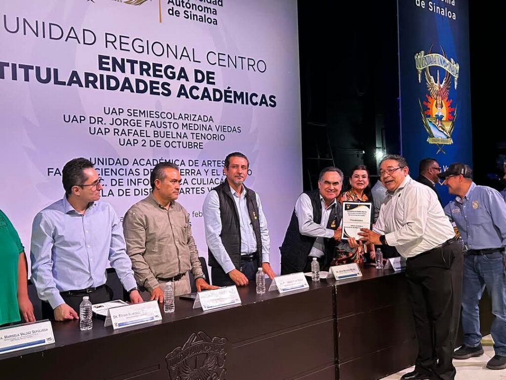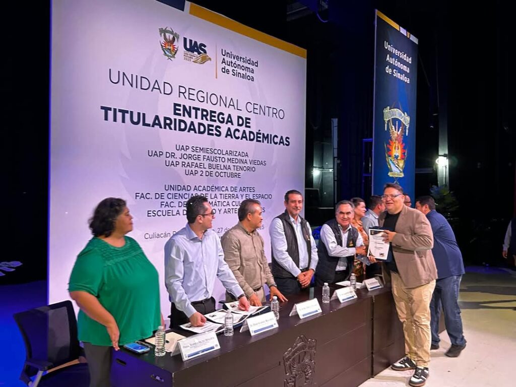 Este medio día se llevó a cabo el acto de entrega de titularidades para los profesores de 8 unidades académicas de la unidad regional centro, en donde colaboran mano a mano la administración de la Universidad Autónoma de Sinaloa que dirige el DR. JESÚS MADUEÑA MOLINA y la dirigencia del SUNTUAS ACADÉMICO, que dirige el maestro SAMUEL CASTRO CAMACHO.