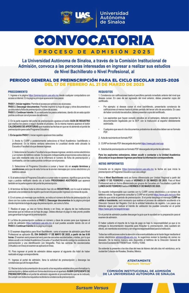 C0NVOCATORIA A PREINSCRIPCIONES EN LA UAS PARA EL CICLO ESCOLAR 2025-2026