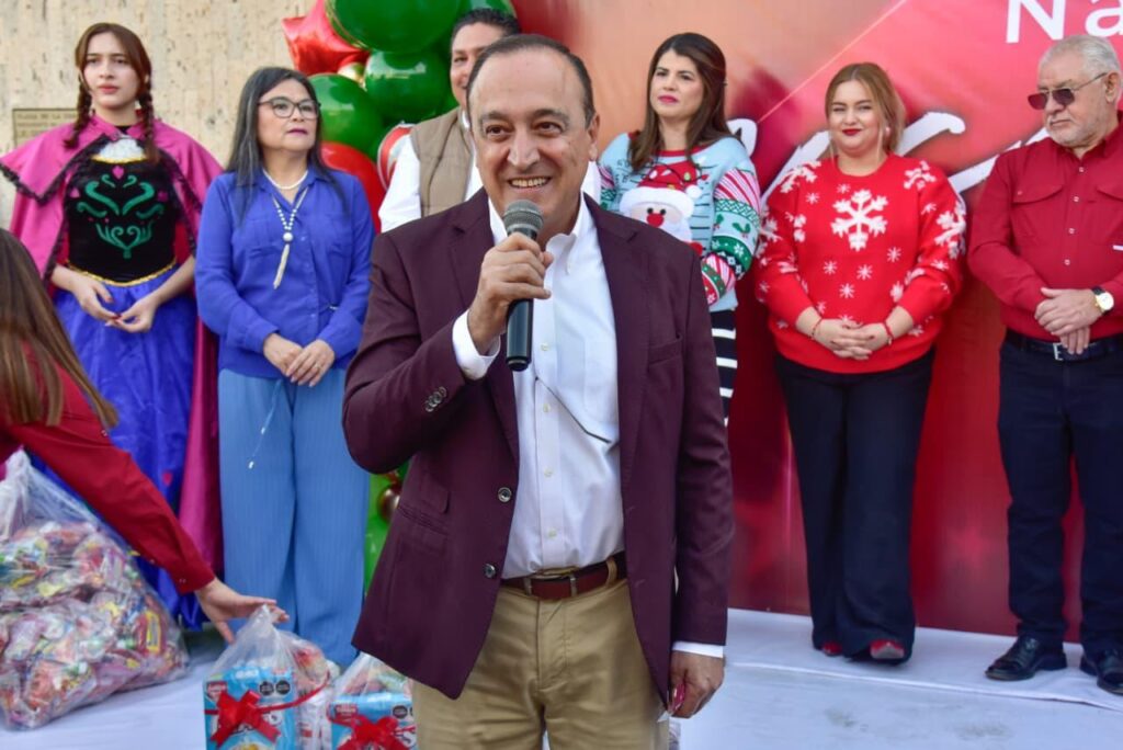 Los Mochis, Ahome, Sinaloa. A 19 de diciembre del 2025.- El Presidente Municipal Antonio Menéndez De Llano Bermúdez celebró Posada Navideña con el Pueblo de Ahome en Palacio Municipal, donde entregó paquetes de dulces, piñatas, despensas y regalos para que cada colonia, ranchería, y sindicatura celebre su propia posada.