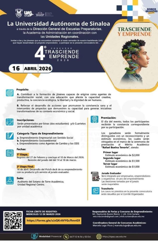 En la Universidad Autónoma de Sinaloa (UAS) existe la convicción de que el emprendimiento juvenil es una vía para generar soluciones innovadoras, desafiar lo establecido y construir proyectos con sentido propio. Por ello, la institución convoca a los estudiantes de bachillerato a participar en el 4to. Concurso «Trasciende Emprende», cuya fase estatal se llevará a cabo el próximo 16 de abril en las instalaciones de la Torre Académica, en la ciudad de Culiacán.