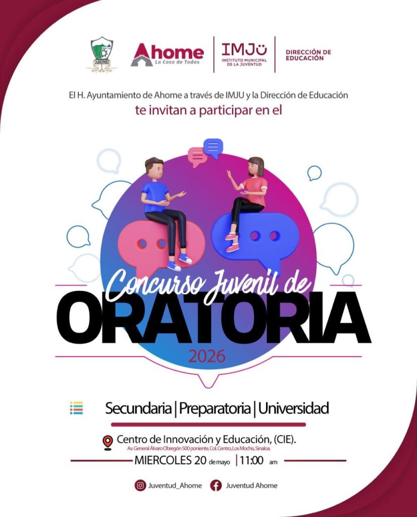 Los Mochis, Ahome, Sinaloa. A 21 de Abril de 2026.- Con el respaldo del Gobierno Municipal que encabeza el Alcalde Antonio Menéndez de Llano Bermúdez, el Instituto Municipal de la Juventud (IMJU), en coordinación con la Dirección de Educación, lanzó la convocatoria para el Concurso Juvenil de Oratoria 2026, espacio que busca abrir la participación de los jóvenes ahomenses en temas de relevancia social.