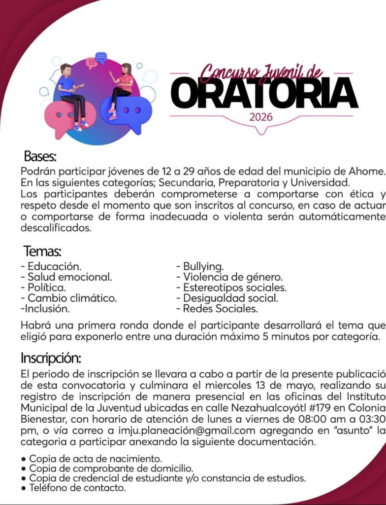 “Traemos el concurso de oratoria que se va a realizar el 20 de mayo, a las 11 de la mañana en el CIE, pero la convocatoria se va a cerrar el 13 de mayo”, expresó Caballero Fierro, quien detalló que entre los requisitos se solicitan copias del acta de nacimiento, comprobante de domicilio, credencial de estudiante o constancia de estudios, así como teléfono de contacto.
