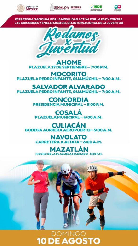 Culiacán, Sinaloa ; 10 de agosto de 2025.- En el marco de la conmemoración del Día Internacional de la Juventud a celebrarse el próximo 12 de agosto, y en coordinación con distintas instancias Federales, Estatales y Municipales, el Instituto Mexicano de la Juventud coordina «La Rodada y Carrera por la Paz y contra las Adicciones».