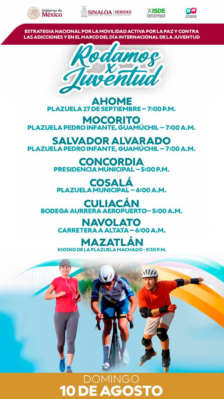 Culiacán, Sinaloa ; 10 de agosto de 2025.- En el marco de la conmemoración del Día Internacional de la Juventud a celebrarse el próximo 12 de agosto, y en coordinación con distintas instancias Federales, Estatales y Municipales, el Instituto Mexicano de la Juventud coordina «La Rodada y Carrera por la Paz y contra las Adicciones».
