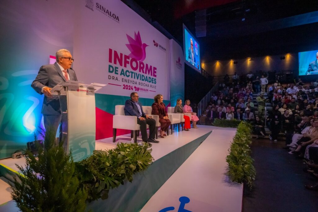 En su mensaje, la presidenta del Sistema DIF Sinaloa, Eneyda Rocha Ruiz, señaló que todas acciones realizadas y que dio cuenta en su Informe de Labores 2024 fueron para atender la encomienda del gobernador Rubén Rocha Moya, “a quien le agradezco su presencia y sobre todo la confianza en nosotras y nosotros para dedicarnos a la construcción de un Sinaloa inclusivo, más humanista, más justo y más solidario”.
