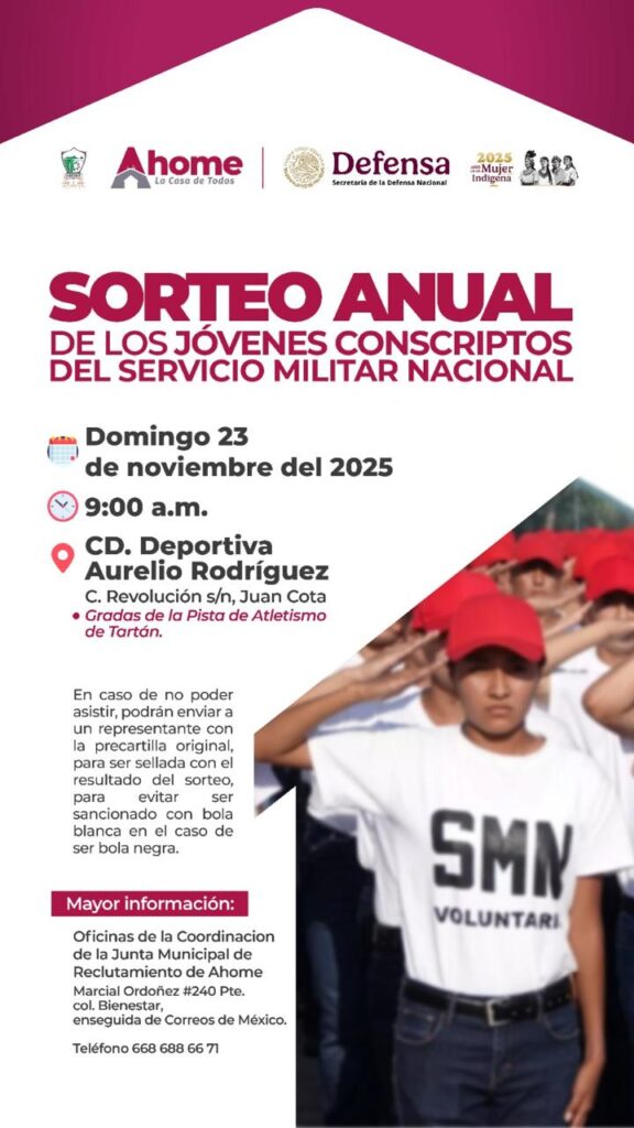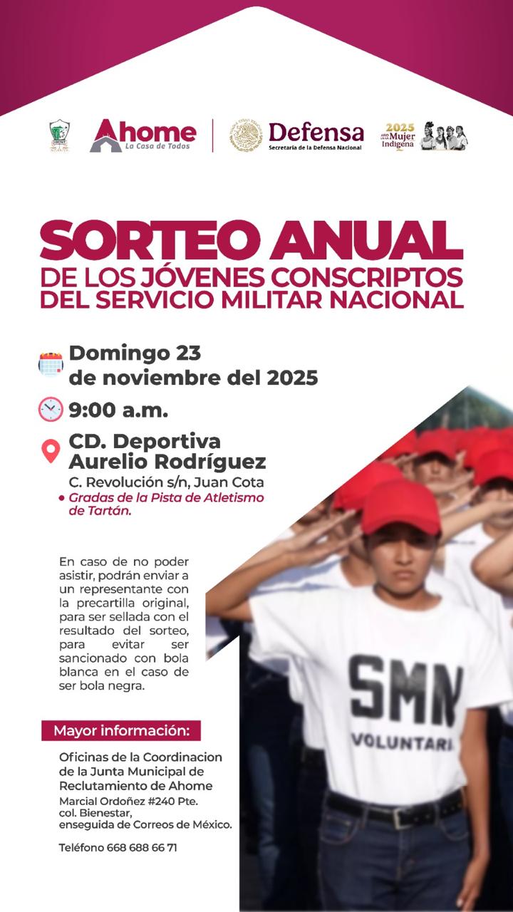 Los Mochis, Ahome, Sinaloa. A 19 de noviembre del 2025.- La Junta Municipal de Reclutamiento de Ahome, informa a los jóvenes de la Clase 2007 y remisos, que obtuvieron su Cartilla Militar (Precartilla) en el presente año, que deberán estar presentes el día domingo 23 de noviembre próximo, en el Sorteo Anual de los Jóvenes Conscriptos del Servicio Militar Nacional en la pista de tartán de la ciudad deportiva Aurelio Rodríguez Ituarte de esta ciudad de Los Mochis.