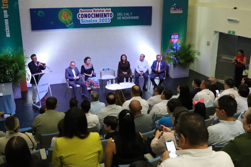 *La titular de SEPyC, Lic. Gloria Himelda Félix Niebla; el director general de COBAES, Dr. Santiago Inzunza Cázares; y el director general de CONFÍE, Dr. Carlos Karam Quiñones, inauguran la Semana Estatal del Conocimiento 2025