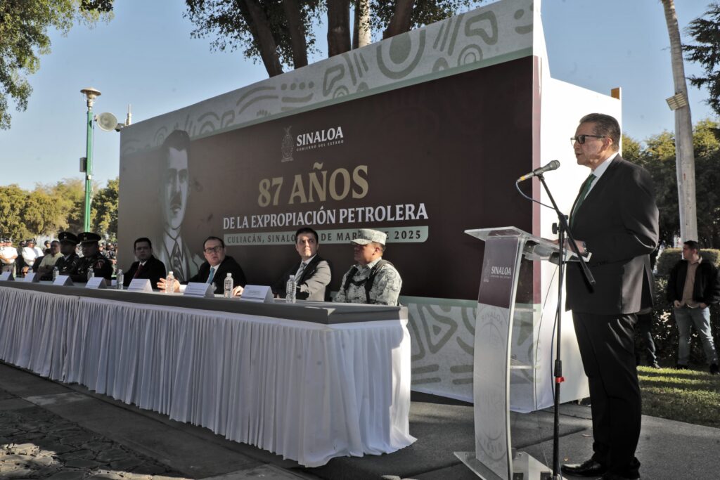 Culiacán, Sinaloa 18 de marzo de 2025.- El Secretario General de Gobierno Feliciano Castro Meléndrez, en representación del Ejecutivo estatal, acompañado de autoridades civiles y militares presidieron el acto conmemorativo del aniversario de la Expropiación Petrolera de 1938, con el izamiento de bandera a toda hasta y Honores de Ordenanza en la plaza cívica de Palacio de Gobierno.