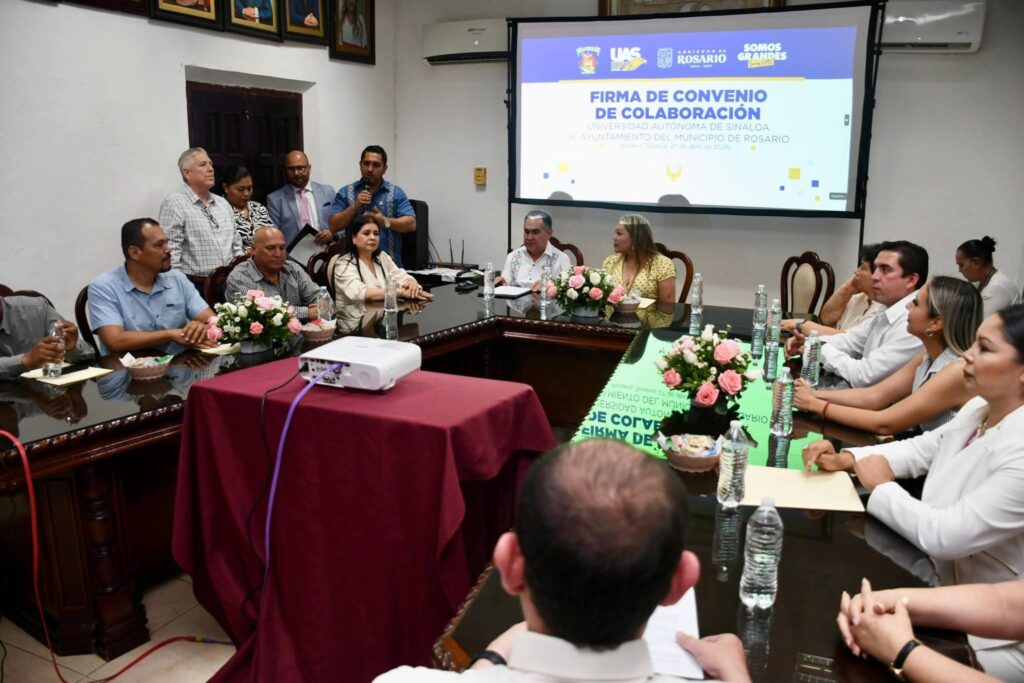 La Universidad Autónoma de Sinaloa (UAS) y el Ayuntamiento de El Rosario firmaron un convenio de colaboración institucional en beneficio de la comunidad universitaria, así como del desarrollo económico y social de este municipio sureño.