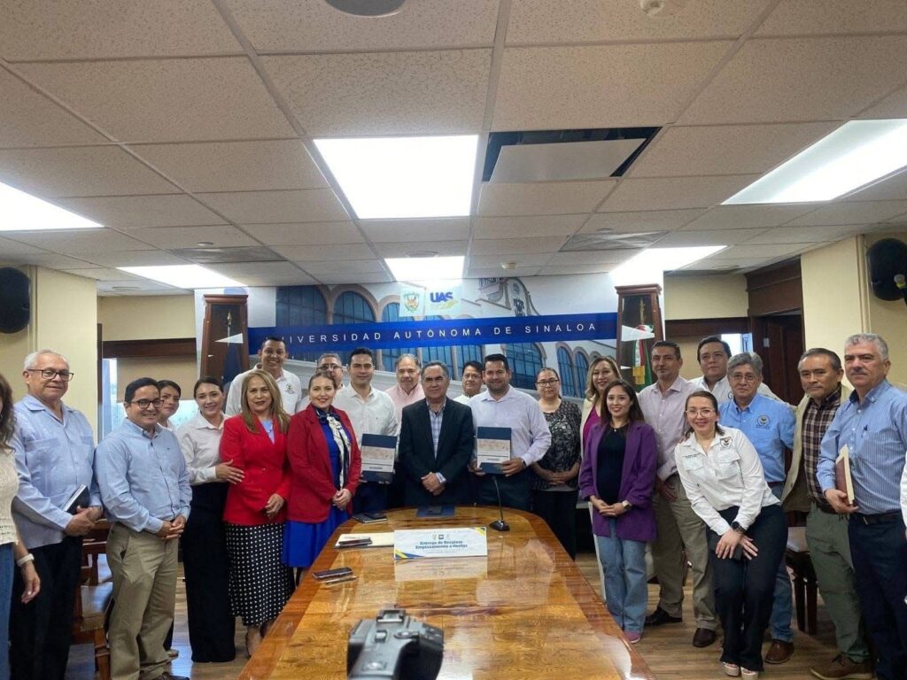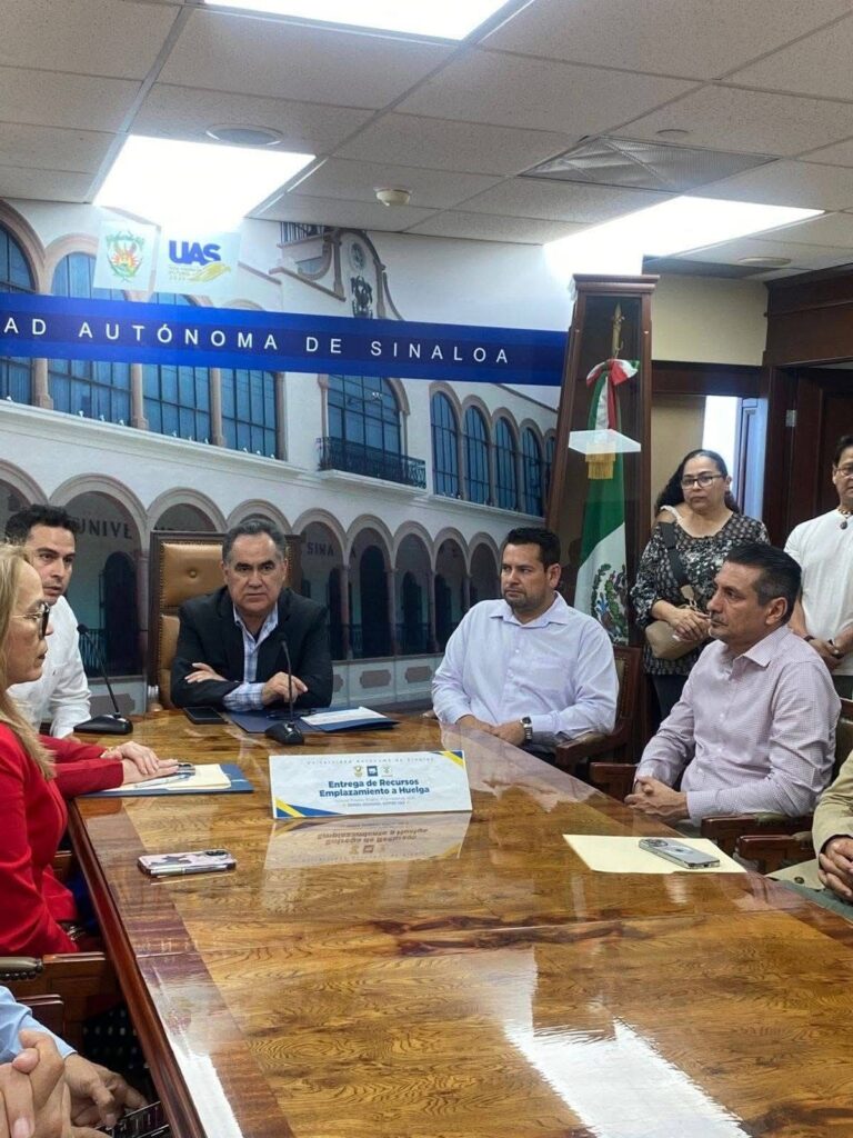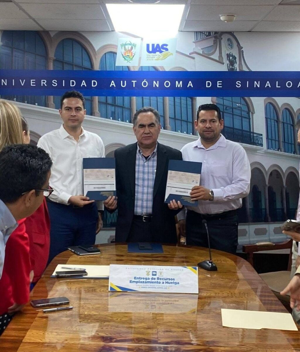 Culiacán de Rosales, Sinaloa, a 13 de marzo de 2026.- El SUNTUAS, a través de los secretarios generales de cada sección, el Dr. Samuel Jesús Castro Camacho, por parte de Académicos, y el Lic. Isfa Bernarbé Leal Salazar, de Administrativos e Intendencia, ambos acompañados por miembros de su Comité Ejecutivo, sostuvo una reunión con el Rector de la Universidad Autónoma de Sinaloa, Dr. Jesús Madueña Molina, con el propósito de recibir la entrega de los recursos resolutivos derivados del Emplazamiento a Huelga correspondiente al periodo 2025-2026.