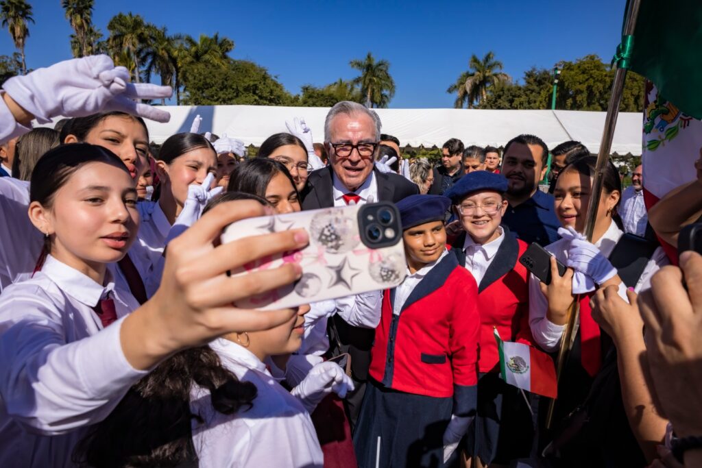 Justamente, como parte del evento que tuvo lugar en la explanada de Palacio de Gobierno, se llevó a cabo un enlace con el mismo acto cívico que simultáneamente encabezó en el Zócalo de la Ciudad de México la presidenta Claudia Sheinbaum, quien al igual que lo hizo el gobernador Rocha aquí en Sinaloa, abanderó a varias escuelas de educación básica.
