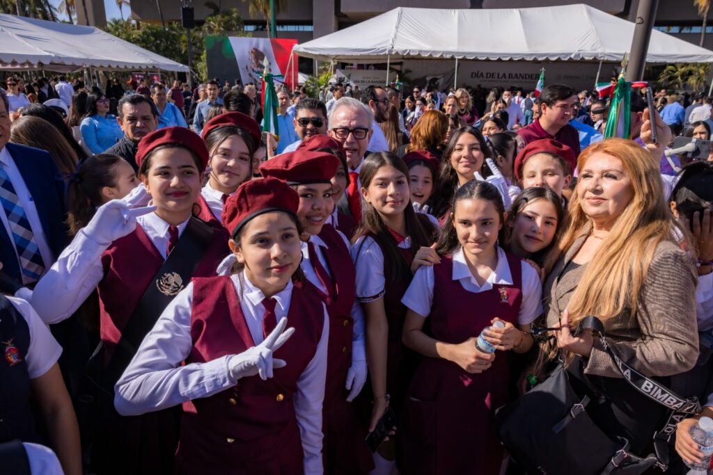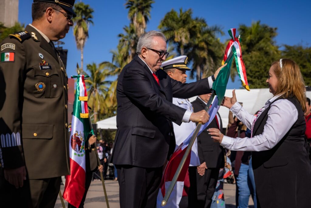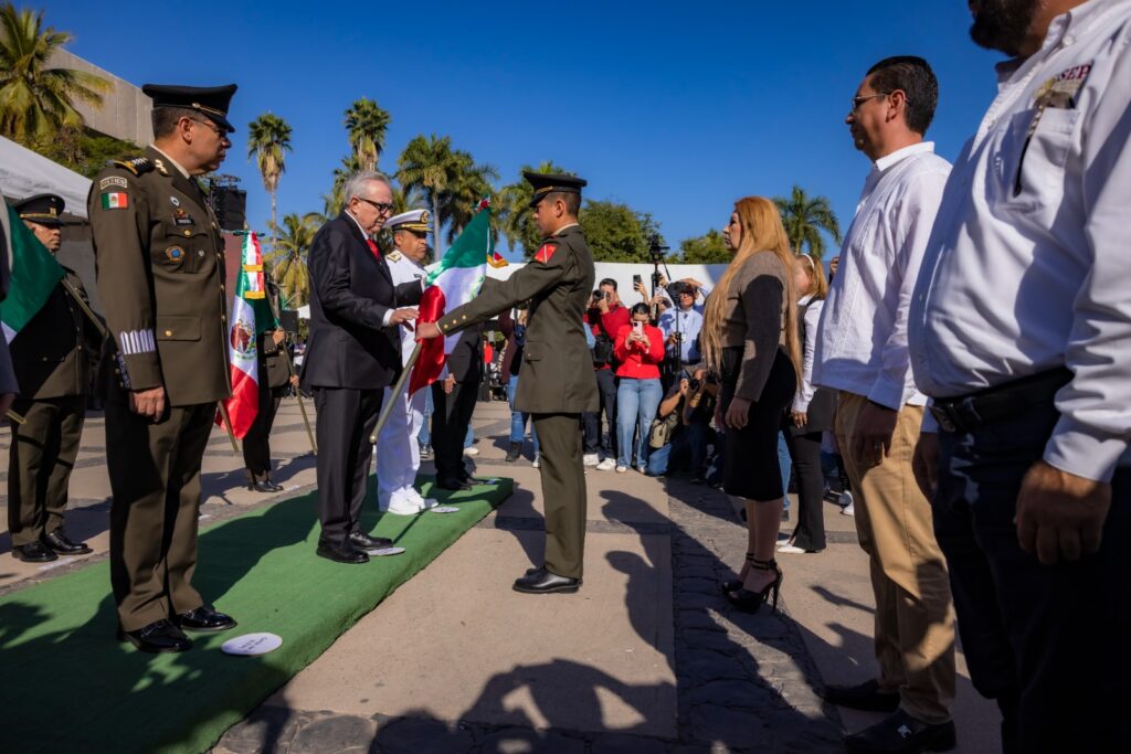 Como parte de la ceremonia, el gobernador Rocha, acompañado por los representantes de los demás Poderes del Estado, autoridades civiles y militares, abanderó a las escoltas de siete escuelas de educación básica: la Escuela Primaria Profr. Ruperto Verdugo Palazuelos, Escuela Primaria Reynaldo González López, Escuela Primaria Distrito Federal, Escuela Secundaria Técnica No. 85, Escuela Secundaria General No. 4, Escuela Secundaria Profr. Reynaldo Patrón Ortega, y la Telesecundaria No. 93, en representación de los 25 planteles que asistieron a la ceremonia.