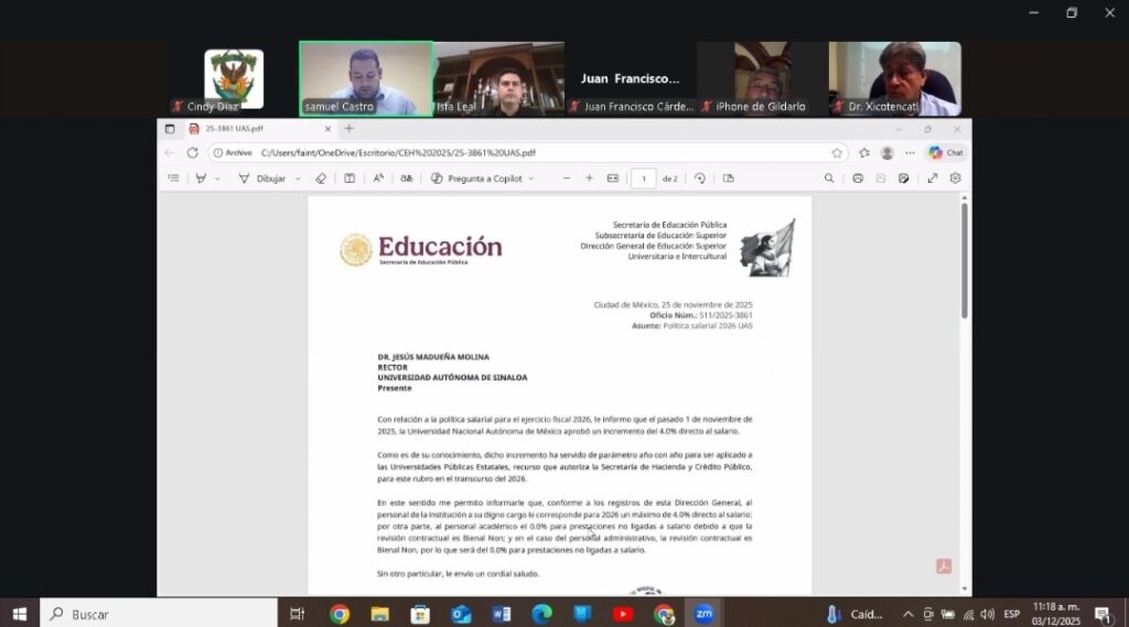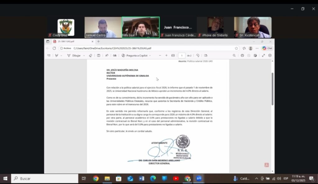 Por último, informó que el incremento salarial al personal sindicalizado es del 4 por ciento directo al salario tabular aplicable a partir del 1° de enero de 2026, de acuerdo con el documento que recibió la UAS por parte de la Secretaría de Educación Pública y la Dirección General de Educación Superior, presentado durante la sesión.
