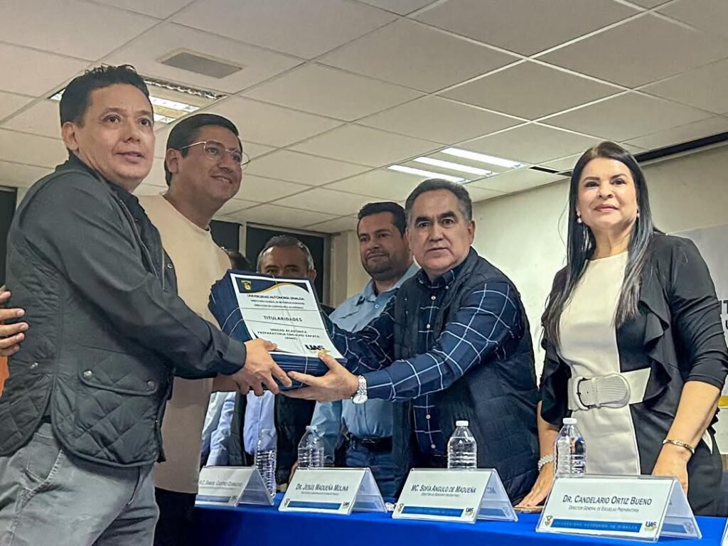 Como parte de la dinámica sindical y los trabajos coordinados entre la Dirección General de Recursos Humanos, Contraloría Académica y el SUNTUAS Sección Académicos, el día de hoy se hizo entrega de los documentos oficiales de Titularidades en la UA Preparatoria Emiliano Zapara, por parte del Dr. Jesús Madueña Molina Rector de la Universidad Autónoma de Sinaloa, y el MC Samuel Jesús Castro Camacho, Secretario General del SUNTUAS, en presencia distinguidas autoridades.