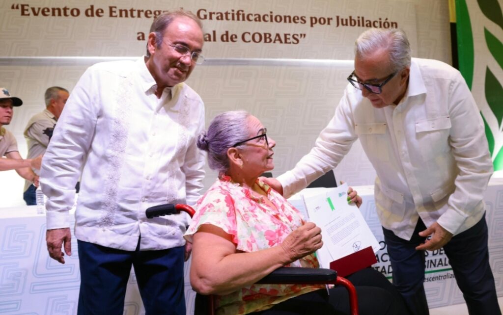 Culiacán, Sinaloa 15 de agosto de 2025.- Reconociendo el esfuerzo y décadas de servicio de las y los trabajadores de COBAES, que durante 25 años y hasta 40 años, han dedicado a preparar a futuras generaciones de sinaloenses, el gobernador Rubén Rocha Moya, entregó estímulos por jubilación a 55 docentes, administrativos y personal de apoyo que, cumplieron sus años de servicio en esta institución educativa.