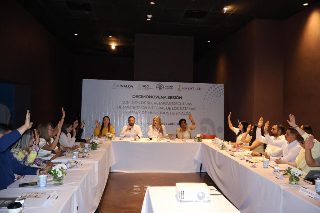 Mazatlán, Sinaloa a 20 de abril del 2026.- Con la presencia de la Presidenta Municipal de Mazatlán, Estrella Palacios Domínguez, se llevó a cabo la Decimonovena Sesión Ordinaria de la Comisión de Secretarías Ejecutivas de Protección Integral de los Sistemas Estatal y Municipales de Sinaloa, un espacio de coordinación interinstitucional orientado a fortalecer las acciones en favor de niñas, niños y adolescentes en la entidad.