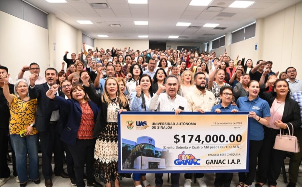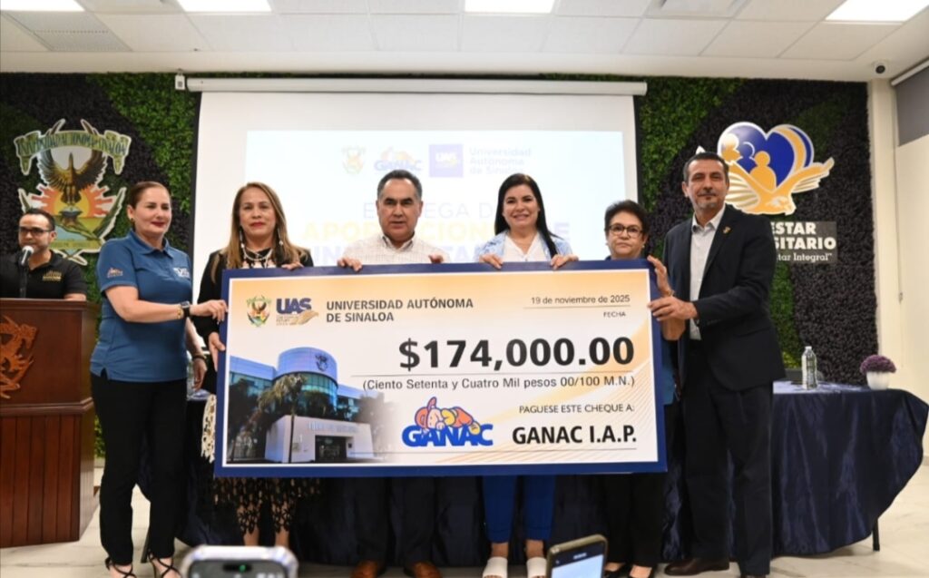 En una muestra de generosidad y compromiso con la sociedad y especialmente con la niñez, la Universidad Autónoma de Sinaloa (UAS) entregó una donación de 174 mil pesos a Ganac, A.C, asociación que atiende a niños con cáncer, cifra que se obtuvo de aportaciones voluntarias de directores de unidades académicas y funcionarios universitarios.