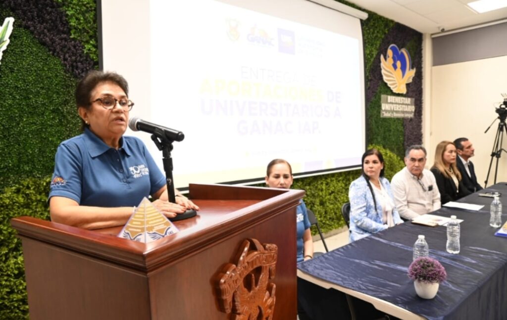 El Rector, doctor Jesús Madueña Molina y la directora de la Unidad de Bienestar Universitario (UBU), doctora Sofía Angulo de Madueña, acompañados del Vicerrector de la Unidad Regional Centro (URC), doctor Wenseslao Plata Rocha y de la Secretaria de Administración y Finanzas, doctora Elizabeth Castillo Cabrera, hicieron la entrega simbólica de un cheque a los representantes de Ganac.
