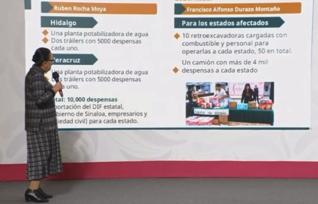 Culiacán, Sinaloa, a 17 de octubre de 2025.- Durante la Mañanera del Pueblo ofrecida este viernes por la presidenta de la República, Claudia Sheinbaum desde Palacio Nacional, la secretaria de Gobernación, Rosa Icela Rodríguez, informó que el Gobierno del Estado de Sinaloa, que encabeza el doctor Rubén Rocha Moya, envió un importante apoyo a los estados de Hidalgo y Veracruz para ayudar a los damnificados por las recientes lluvias que provocaron grandes inundaciones en esa zona del país.