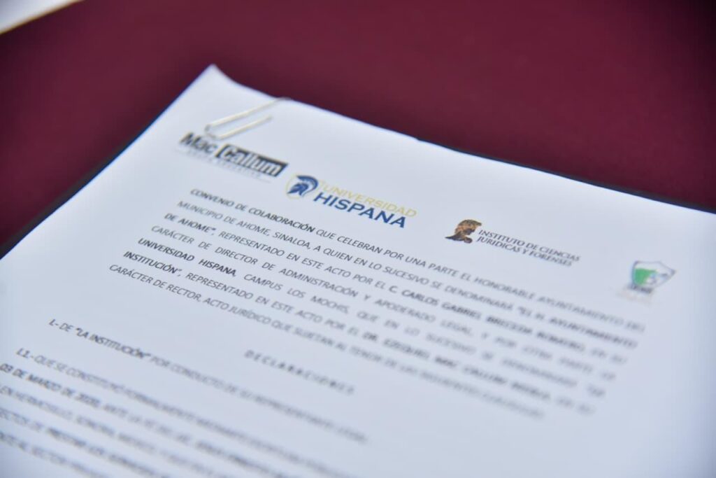 Los Mochis, Ahome, Sinaloa. A 9 de Octubre de 2025.- En un acto que reafirma el compromiso del Gobierno Municipal con la educación y el desarrollo humano, el Ayuntamiento de Ahome y la Universidad Hispana firmaron un convenio de colaboración con el propósito de fortalecer los lazos entre ambas instituciones y emprender acciones conjuntas en materia académica, social y comunitaria, en beneficio de los jóvenes y de la población ahomense.