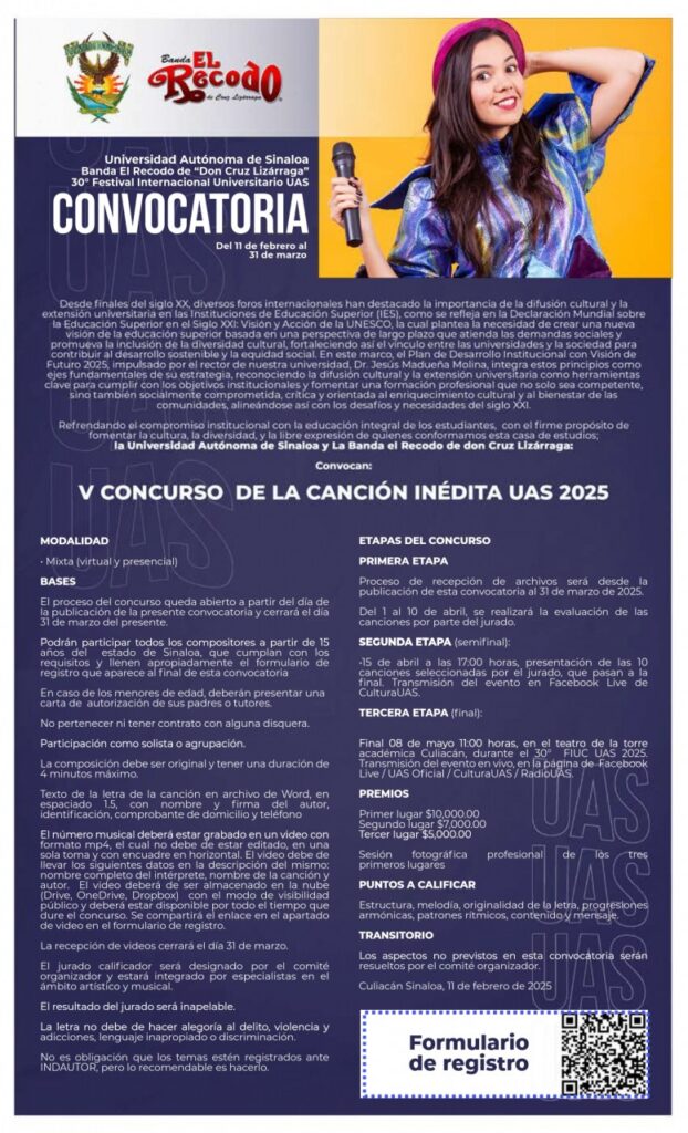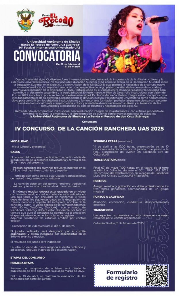 La Universidad Autónoma de Sinaloa (UAS) y la Banda El Recodo de Don Cruz Lizárraga, convocan a estudiantes de la institución y compositores del estado de Sinaloa a participar en el Concurso de la Canción Ranchera UAS 2025 y en el Concurso de la Canción Inédita Género Libre UAS 2025.