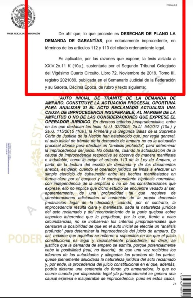 “Es bueno que se sepa que fue desechado ese amparo interpuesto porque ni siquiera pudieron pasar la primera aduana, por decirlo de alguna manera, que hay en un juicio de amparo, ¿cuál es? que te admitan el amparo”, expresó.