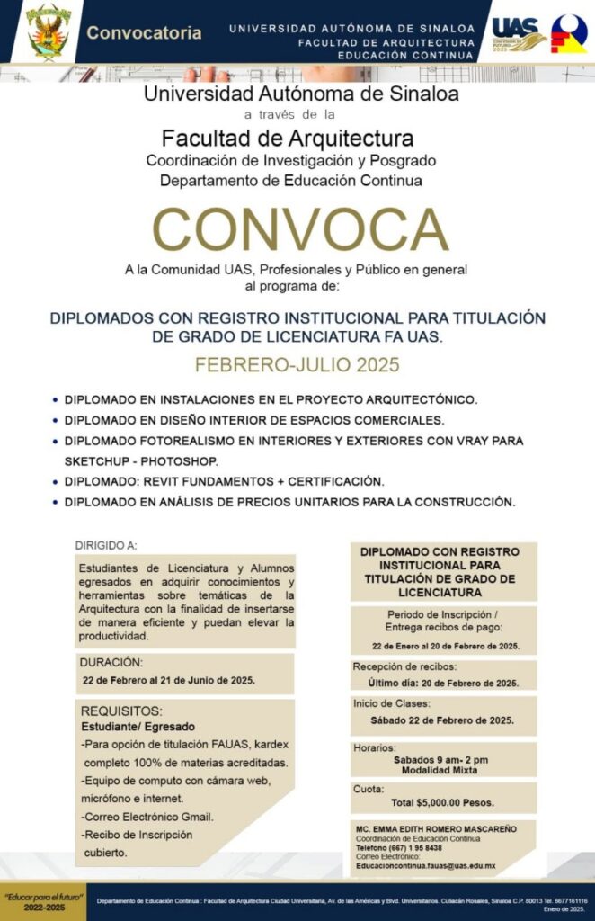 “Va a ser sabatino de 9:00 de la mañana a 2:00 de la tarde, iniciamos el 22 de febrero y terminamos aproximadamente para inicios de julio (…) invitamos a todos los alumnos aquí pueden solicitar información en la coordinación de Educación Continua, en el número de celular 6671958438, o al correo electrónico educacioncontinua.fauas@uas.edu.mx», mencionó.