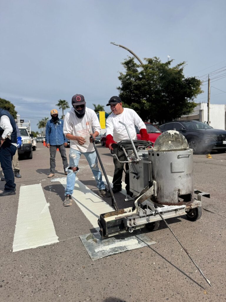 Ayuntamiento de Ahome inició pruebas de pintura termoplástica en pasos peatonales del sector Centro para mejorar visibilidad y seguridad. El Alcalde supervisó trabajos en Guillermo Prieto y Rafael Buelna.