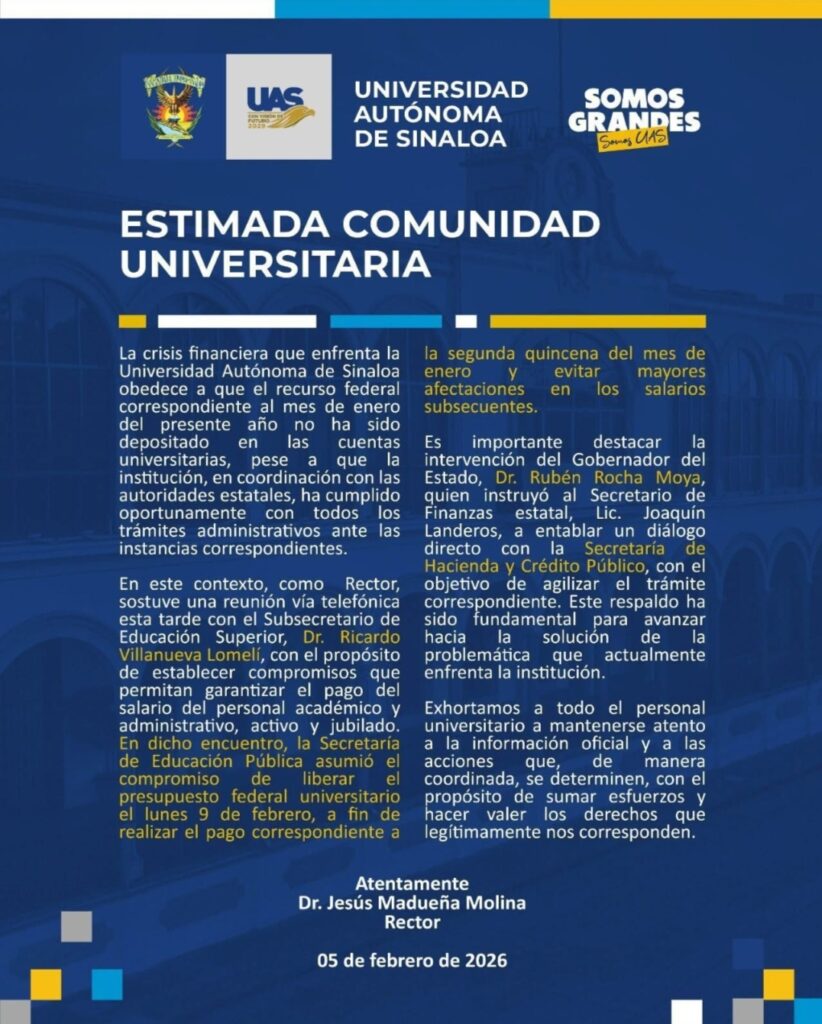 La Secretaría de Educación Pública (SEP), a través del subsecretario de Educación Superior, el doctor Ricardo Villanueva Lomelí, se comprometió a entregar los recursos de la Universidad Autónoma de Sinaloa (UAS) correspondientes al mes de enero el próximo lunes 9. Por lo tanto, se prevé que ese mismo día comience la dispersión del pago a las y los trabajadores universitarios.