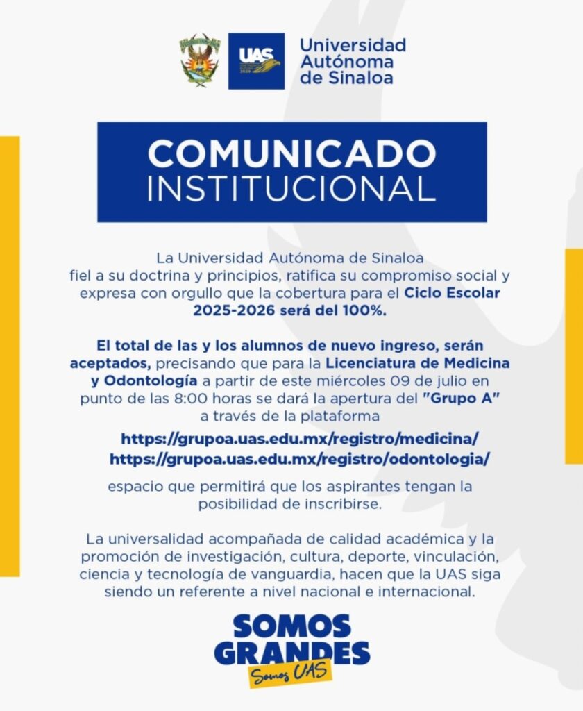LA UAS DARA COBERTURA UNIVERSAL EN EL CIVLO ESCOLAR 2025-2026. SERAN ACEPTADOS EL TOTAL DE LOS ALUMNOS DE NUEVO INGRESO…..