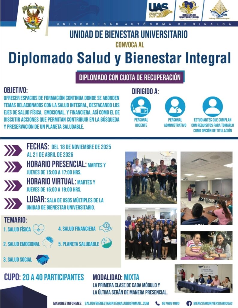 En el compromiso del bienestar integral y la formación humana de la comunidad universitaria, la Unidad de Bienestar Universitario (UBU) de la Universidad Autónoma de Sinaloa (UAS), lanzó la convocatoria del Diplomado “Salud y bienestar integral” en su cuarta edición, explicó Diana Sugey Mendoza Cital, coordinadora de este programa.
