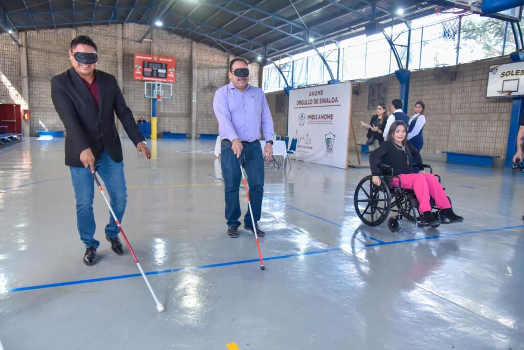 Durante la actividad, los regidores Adrián Baldenebro, Trinidad Velázquez y Lidia Adela Reyes, al igual que jóvenes estudiantes, se vendaron los ojos y utilizaron bastones guía, así como sillas de ruedas, para vivir en carne propia las dificultades que enfrentan las personas con discapacidad en su día a día.