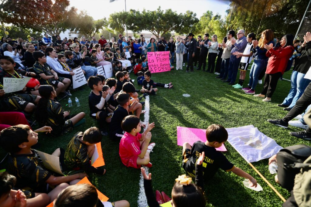 Además, se comprometió a realizar canchas en 3 colonias del sector, derivado de las peticiones hechas por los asistentes. “Los gobiernos de nosotros no mienten, no mienten y no traicionan a la gente. Ya les dije lo vamos a hacer no puedo quedar mal, vamos a atender, tanto a la Plutarco, como a Los Linces de allá de la Ruiz Cortines, como la Estela Ortiz y además aquí, les vamos a hacer la (barda) perimetral y les vamos a poner sus luminarias para que puedan caminar en la noche”, señaló el mandatario estatal.