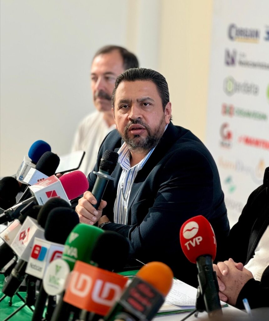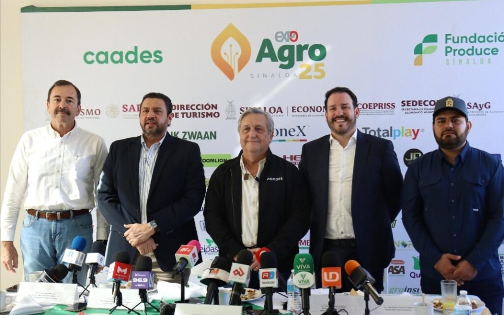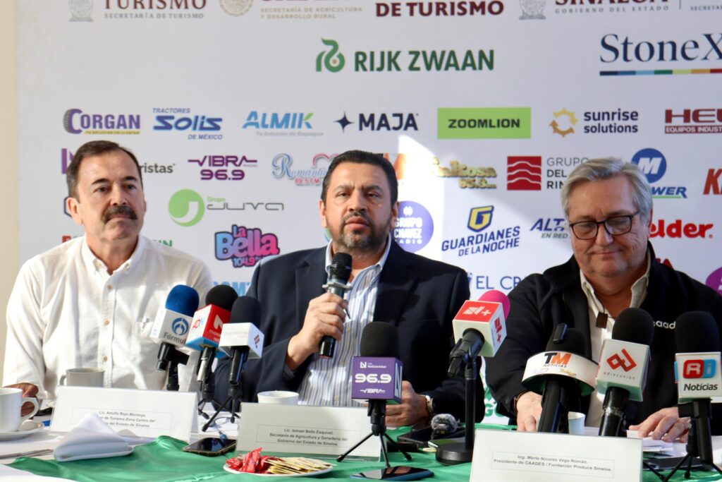 Durante la conferencia de prensa en Fundación Produce, junto con el Presidente de la Caades, Marte Vega Román, el Secretario de Economía del Estado, Ricardo Velarde Cárdenas; Adolfo Rojo Montoya, representante de la Secretaria de Turismo, Mireya Sosa Osuna y el síndico de Aguaruto, José Ramiro García, en donde se dieron a conocer los pormenores de la Expoagro Sinaloa 2025, se anunció también que será inaugurada el próximo día 12 de febrero por el Secretario de Agricultura y Desarrollo Rural, Julio Berdegué Sacristán y el Gobernador Rubén Rocha Moya.