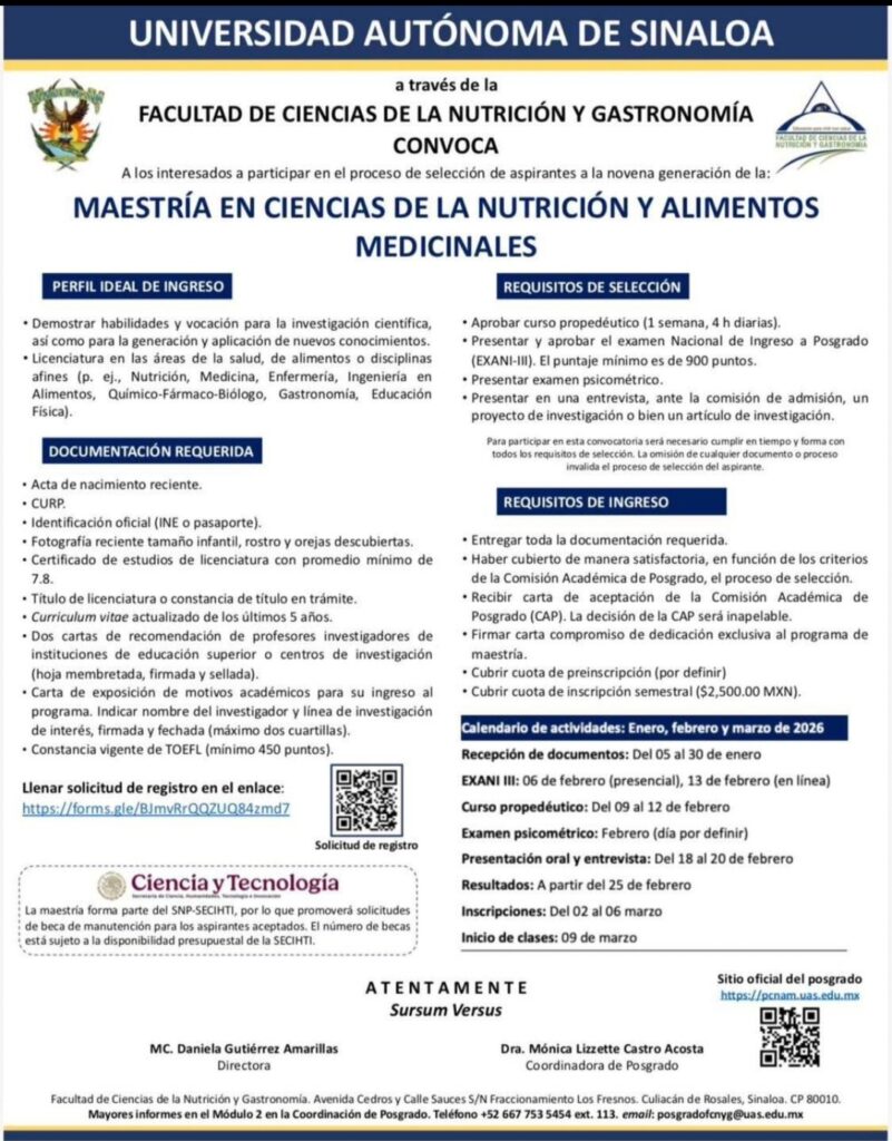 La Facultad de Ciencias de la Nutrición y Gastronomía (FCNyG) de la Universidad Autónoma de Sinaloa (UAS) está convocando a la 9na. Edición de la Maestría en Ciencias de la Nutrición y Alimentos Medicinales, la cual estará iniciando clases el 9 de marzo, por lo aquellos que estén formados en licenciaturas en las áreas de salud, de alimentos y disciplinas afines, están invitados a formar parte de ella, señaló la maestra en ciencias Daniela Gutiérrez Amarillas.