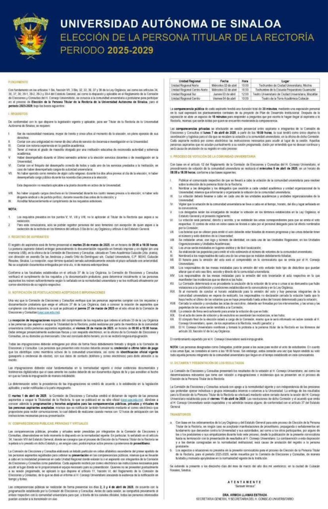 PUBLICAN CONVOCATORIA PARA ELECCION DE RECTOR DE LA UAS PARA EL PERIODO 2025-2029