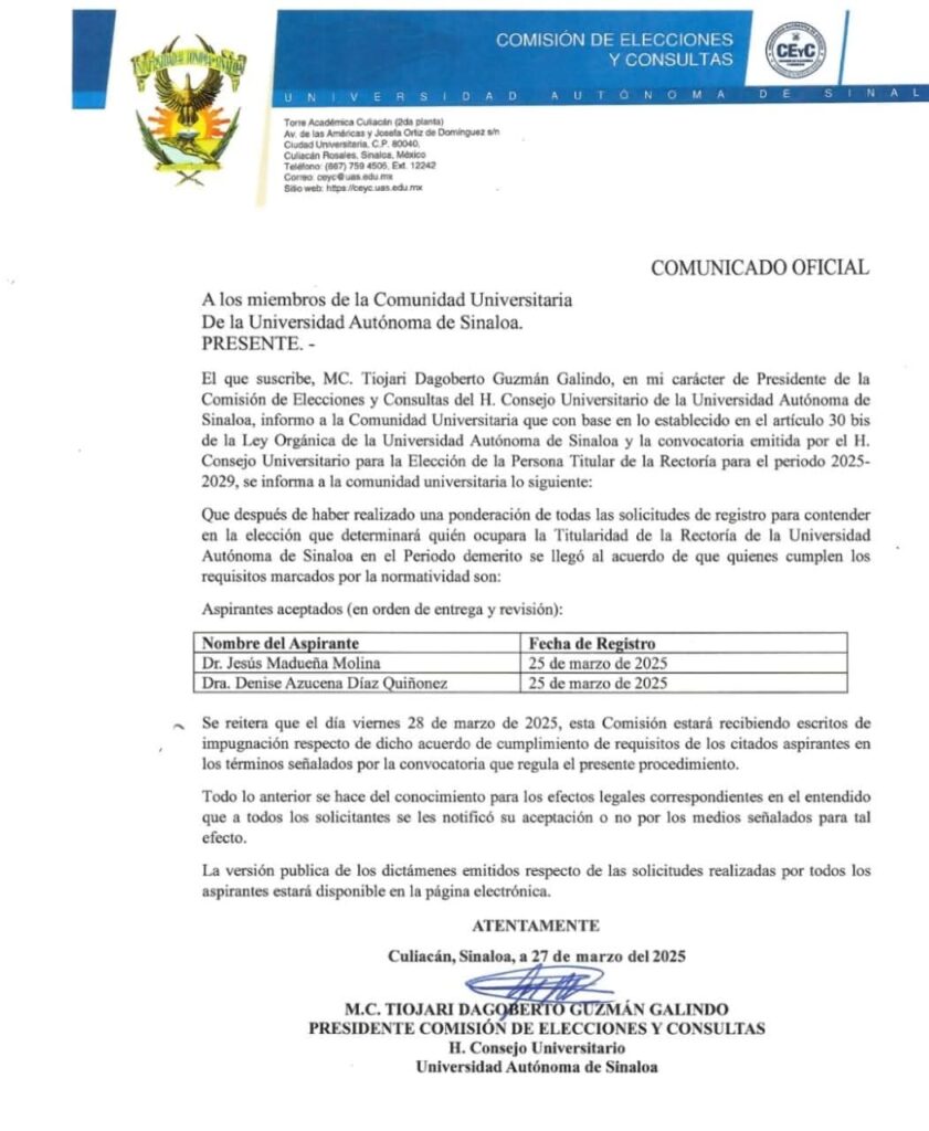 REGISTRO DE CANDIDATOS: JESÚS MADUEÑA MOLINA Y DENISSE AZUCENA DÍAZ QUIÑÓNEZ CUBRIERON LOS REQUISITOS PARA PARTICIPAR EN EL PROCESO 2025 DE ELECCION DE RECTOR DE UAS
