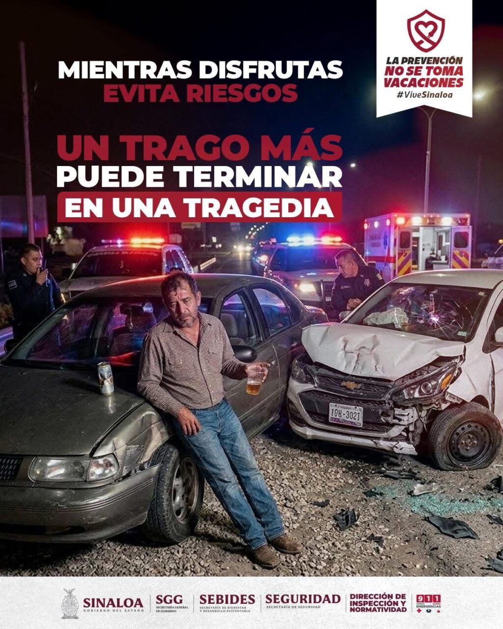 En ese sentido, se promueve el mensaje: “Mientras disfrutas, evita riesgos. Un trago más puede terminar en una tragedia”, dirigido a las familias sinaloenses para fortalecer una cultura de autocuidado, responsabilidad y respeto al conducir.