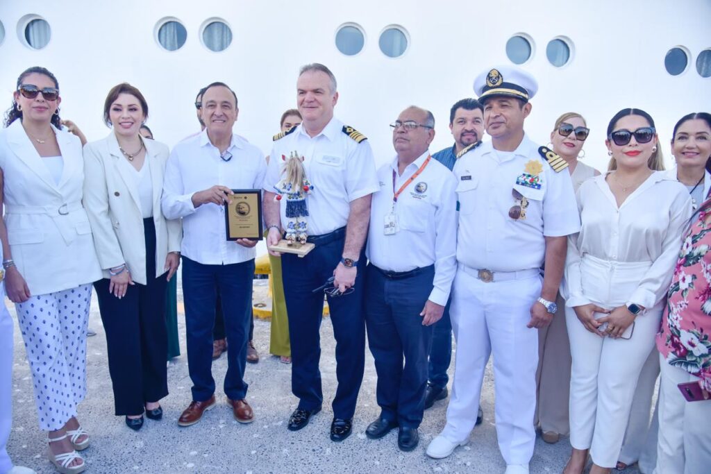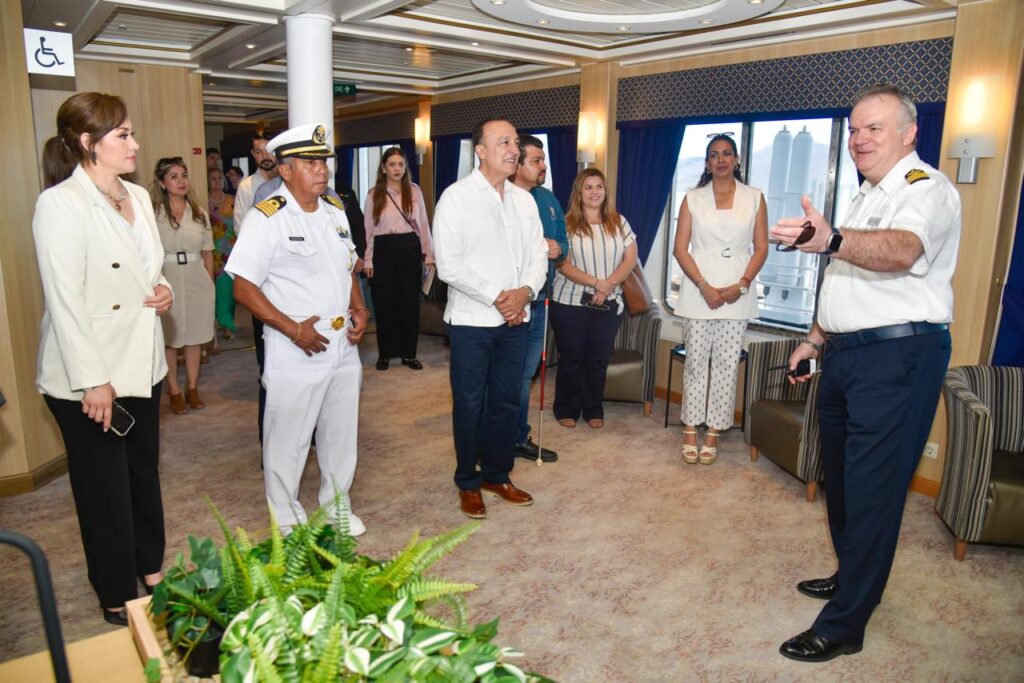 Menéndez De Llano intercambió obsequios con el capitán del Villa Vie Residence, y se tomó la foto del recuerdo con la tripulación y los invitados al evento, quienes realizaron un recorrido por el navío.