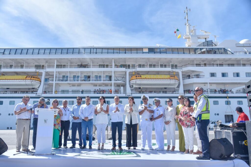 Puerto de Topolobampo, Ahome, Sinaloa, a 19 de Mayo del 2025.- Cientos de turistas internacionales a bordo del Crucero Villa Vie Residence, de la naviera Odyssey, fueron recibidos por autoridades municipales encabezadas por el Alcalde Antonio Menéndez y prestadores de servicios, a ritmo de la tambora sinaloense en el Puerto de Topolobampo, durante su travesía por el mundo.