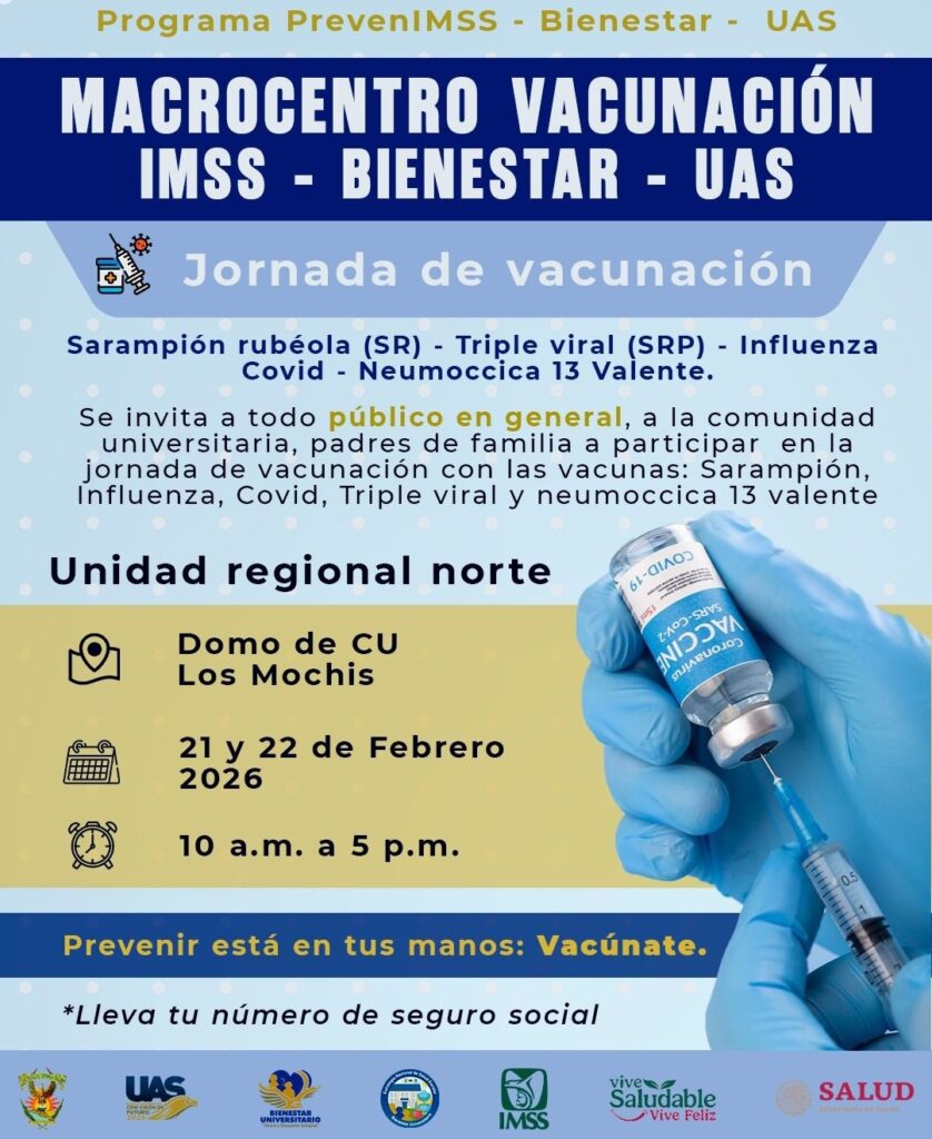 Los Mochis, Sin.- La Universidad Autónoma de Sinaloa, a través de la Unidad de Bienestar Universitario y en colaboración con el Instituto Mexicano del Seguro Social (IMSS) y la Secretaría de Salud, invita a la comunidad universitaria y al público en general a participar en la Jornada de Vacunación del Macrocentro IMSS–Bienestar–UAS.